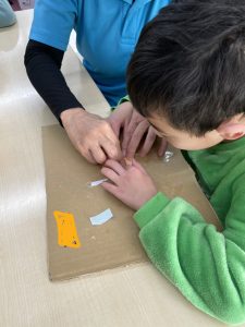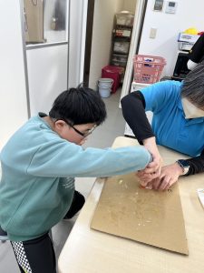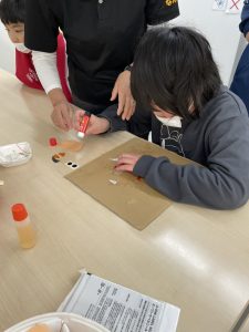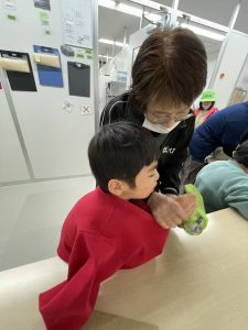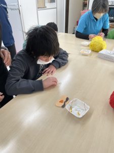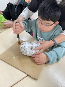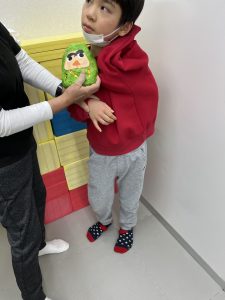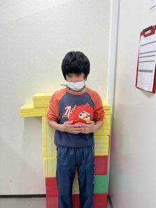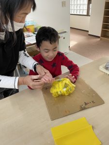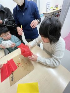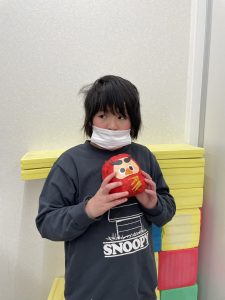 1月はだるまさんを作りました。新聞紙を丸めてぎゅっぎゅっ、力が入りすぎちゃったり、“ぎゅっ” と丸めるのが難しかったりしました。形ができたらマスキングテープを貼って、大小個性的な形。なんだか作った人に似ています(#^.^#)だるまさんのカラーも黄色、黄緑、赤とかわいいだるまさんが完成しました。