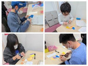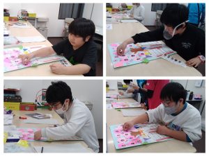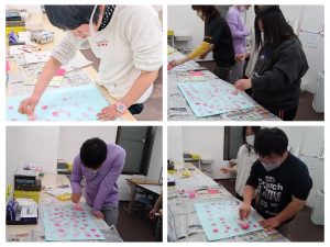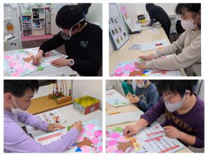 桜の花びらや鳥,旗などを台紙に貼っていきます。