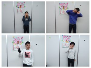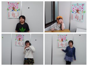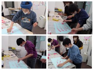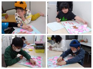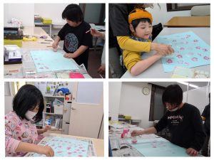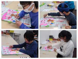 桜の花びらや鳥,旗などを台紙に貼っていきます。
